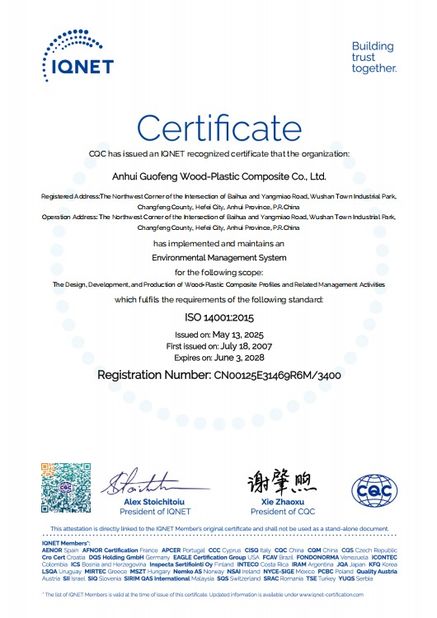 Standard:ISO9001 Number:00122Q33631R5M/3400 Issue Date:2022-05-26 Expiry Date:2025-05-28 Scope/Range:Design,Development and production of wood plastic profiles Issued By:CQC |